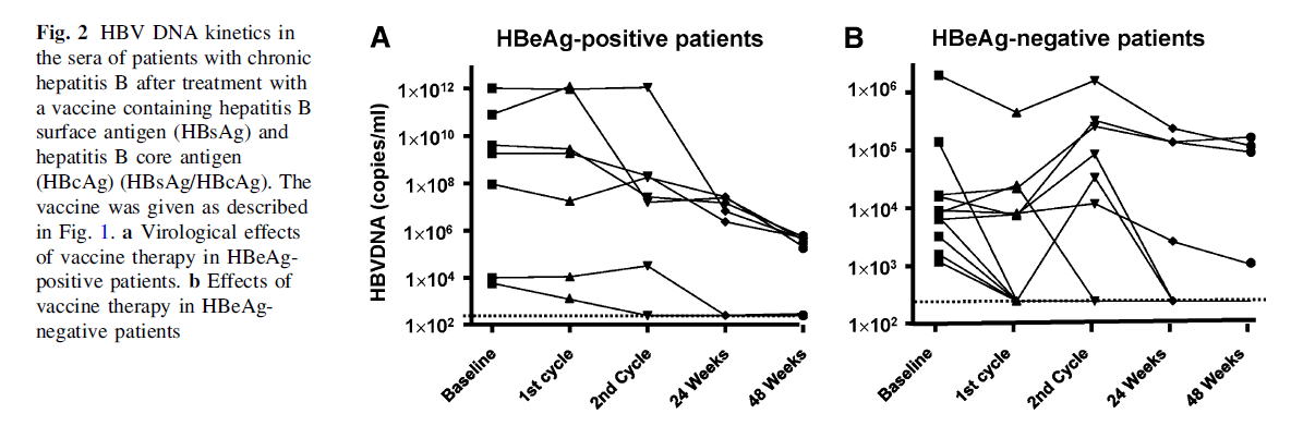 結果顯示,HBsAg / HBcAg 疫苗在所有患者中安全性良好。任何患者中均未記錄到 HBV DNA 或丙氨酸轉氨酶(ALT)的突發性升高。如下