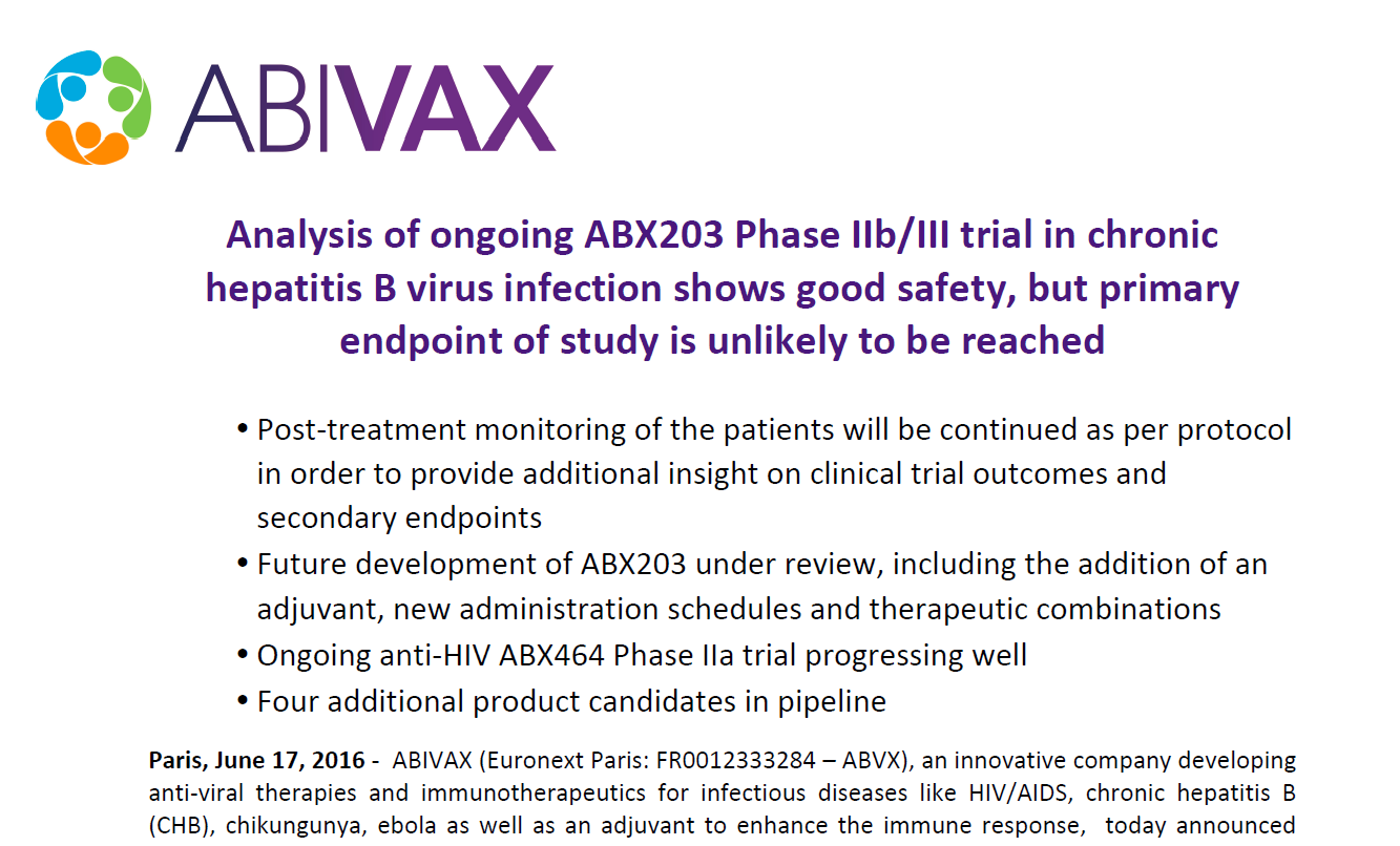 研究最早始于2014年9月,然而試驗進行至 2016年6月時,ABIVAX 公司一則公告讓所有對 ABX203 報以重大希望的都被當頭一棒,公告說“對正在進行的 ABX203 在慢乙肝患者中進行的 phase IIb/III 期臨床分析顯示, ABX203 安全性良好,但研究的首要終點似乎已經不可能達到”。顯然,ABX203 的 phase IIb/III 期臨床失敗了,至于失敗的原因,公告中表示“由于近期歸因于病毒逃逸導致的患者退出率升高,研究的首要終點已經無法達到”。(公告截圖如下)