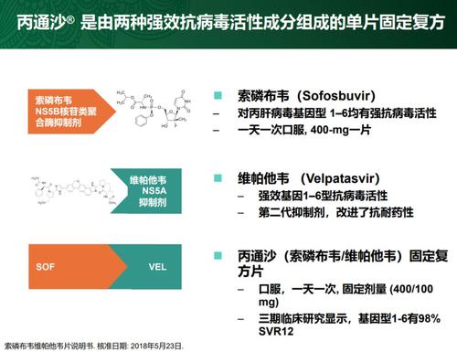 治療成人慢性丙肝方向,索磷布韋和維帕他韋,即丙通沙?,也是國內第一款得到批準的泛基因型單一片劑方案,其中以索磷布韋400mg/維帕他韋100mg能夠治療基因1-6的慢性丙肝;來迪派韋和索磷布韋,即夏帆寧?,也是用于治療成人1-6型慢性丙肝患者,還適合12-18歲青少年丙肝患者使用。