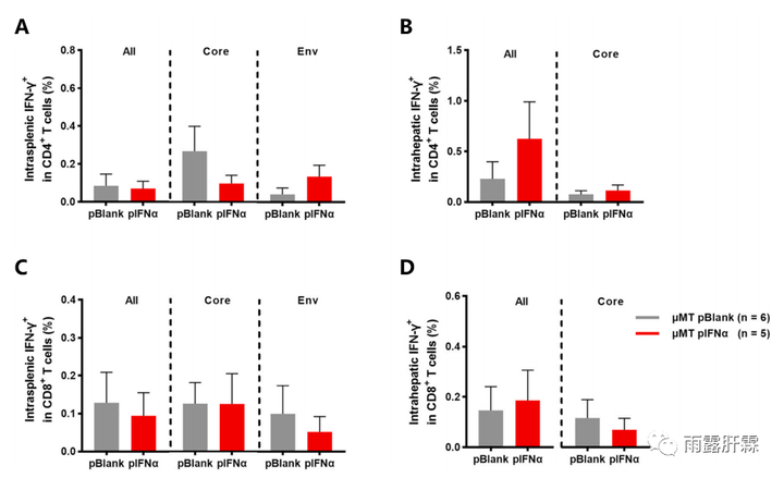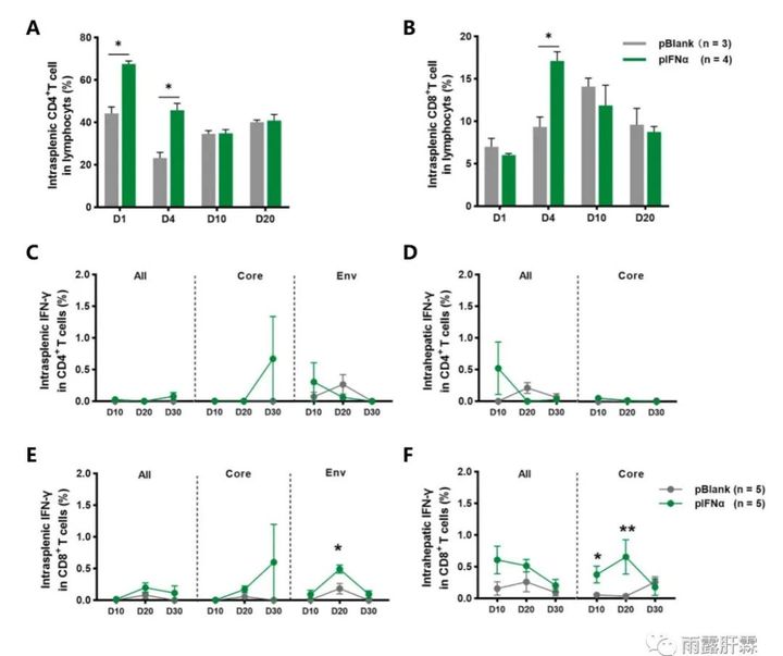 IFN-α注射小鼠的抗HBV細胞免疫應答 ;C - F:用重疊肽刺激小鼠,檢測脾內和肝內IFN-γ+CD4+和IFN-γ+ CD8+ T細胞的頻率,這些重疊肽跨越HBV核心蛋白(core)、包膜蛋白(env)或總HBV蛋白(all)。