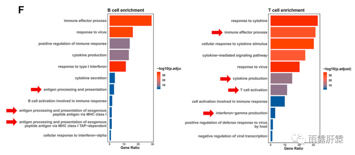 對差異基因(DEGs)進行分析,單核細胞、B細胞和T細胞中部分基因的表達在基線和治療后有明顯的差異,表明IFN-α治療引發了強烈的免疫調節。通過GO功能富集分析將B細胞或T細胞在治療第4周和12周時的表達譜與基線表達譜進行比較。在IFN-α處理后,B細胞中上調的DEGs富集在抗原處理和呈遞途徑,而T細胞的DEGs顯著富集在與細胞因子應答、免疫效應過程、T細胞激活和IFN-γ產生的相關通路中。