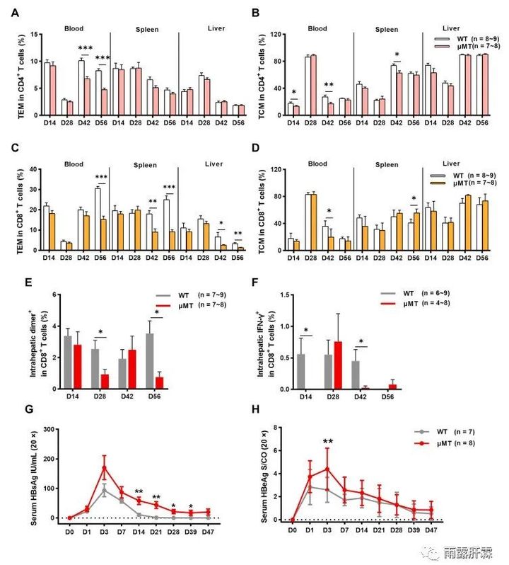 在注射后的第28天和56天,μMT小鼠肝內CD8+ T細胞的頻率顯著低于對照組。同時,μMT小鼠肝內IFN-γ的產生減少,提示細胞毒性T細胞的功能減弱。因此,μMT小鼠的血清HBsAg、HBeAg、肝內HBcAg清除延遲,且不能產生血清抗-HBs。