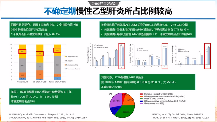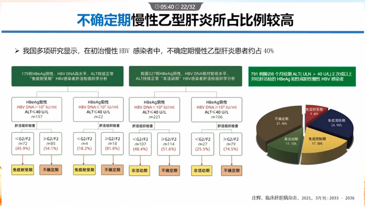 不確定期慢乙肝患者所占比例較高,HBV感染的每一期都存在不同比例的不確定期,總體約占40%。