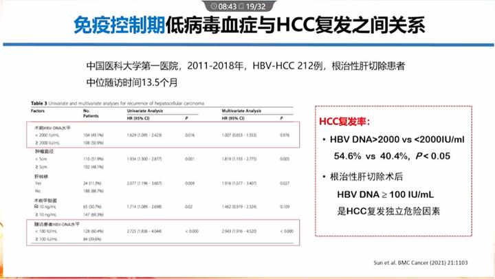 中國醫科大學第一醫院研究:術前HBV DNA > 2000 IU/mL、術后HBV DNA ≥ 100 IU/mL的患者都有較高的HCC復發風險。