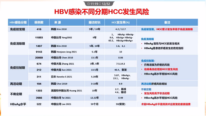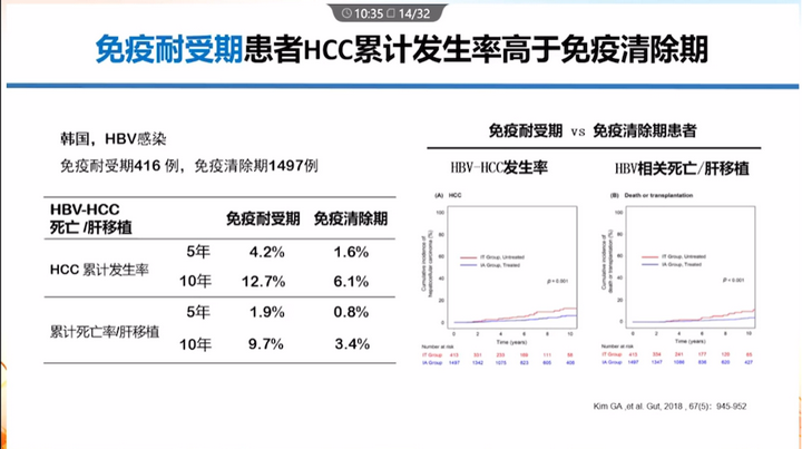 韓國研究:隨訪10年,免疫耐受期HCC累積發生率為12.7%,免疫清除期為6.1%。因此,免疫耐受期患者的HCC累積發生率高于免疫清除期。