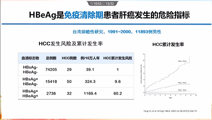 臺灣前瞻性研究:HBeAg陽性免疫清除期患者的HCC發生風險高于HBeAg陰性患者。