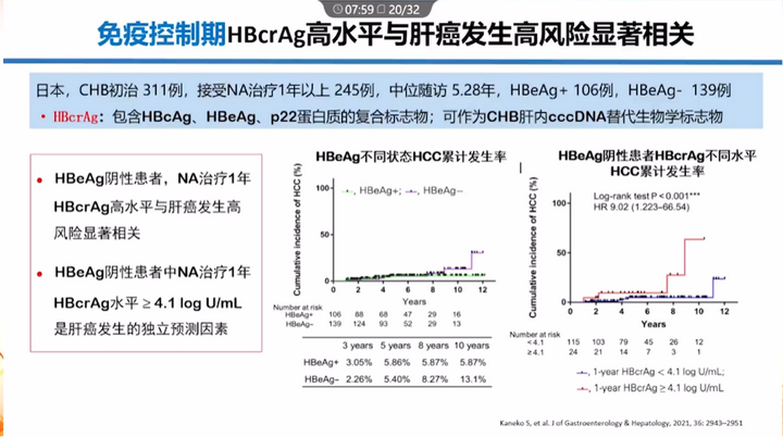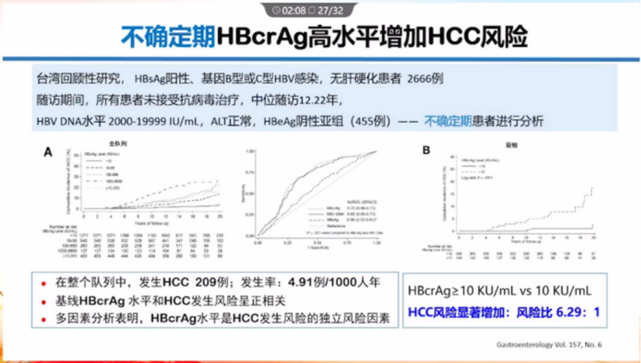 臺灣回顧性研究:不確定期患者HBcrAg ≥ 10 KU/mL,HCC的發生風險增加6.29倍。所以有條件的人群可以監測該指標。