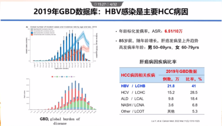 2019年GBD數據庫:肝癌年齡標準化發病率為6.51/10萬。高發病率年齡:男性為50 - 69歲,女性為60 - 79歲。無論哪個年齡段,HBV感染都是最主要的HCC病因,占41%。