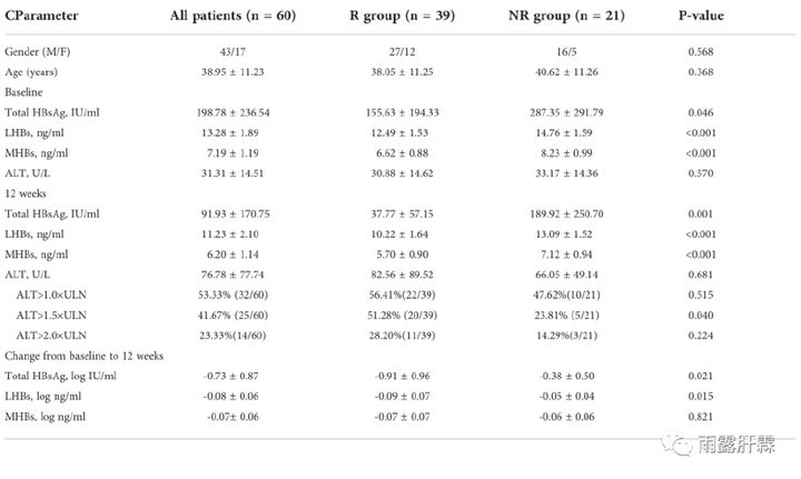 共納入60例患者(R組39例,NR組21例),均為亞洲人。R組平均年齡為38.05 ± 11.25歲,NR組平均年齡為40.62 ± 11.26歲。R組和NR組男性比例分別為69.23%(27/39)和76.19%(16/21)。兩組患者的年齡、性別無顯著差異(P = 0.368,P = 0.568)。