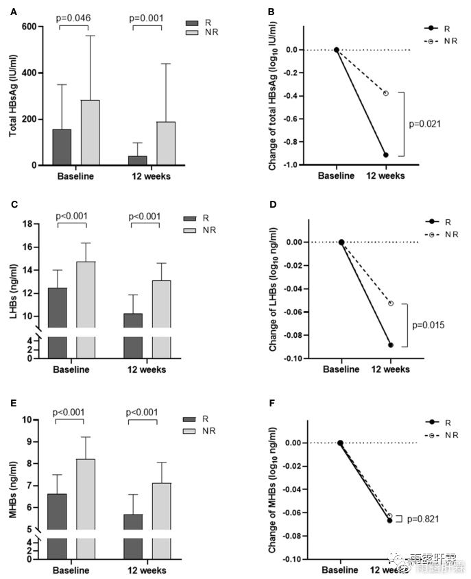 圖1:R組和NR組在基線和治療第12周時HBsAg、LHBs和MHBs水平的變化