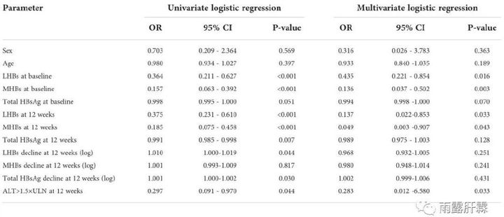 單因素logistic回歸分析表明基線LHB和MHB水平,第12周HBsAg水平、LHB和MHB水平,第12周HBsAg和LHB水平的下降幅度(log)、第12周ALT > 1.5 × ULN均為HBsAg清除的預測因素。